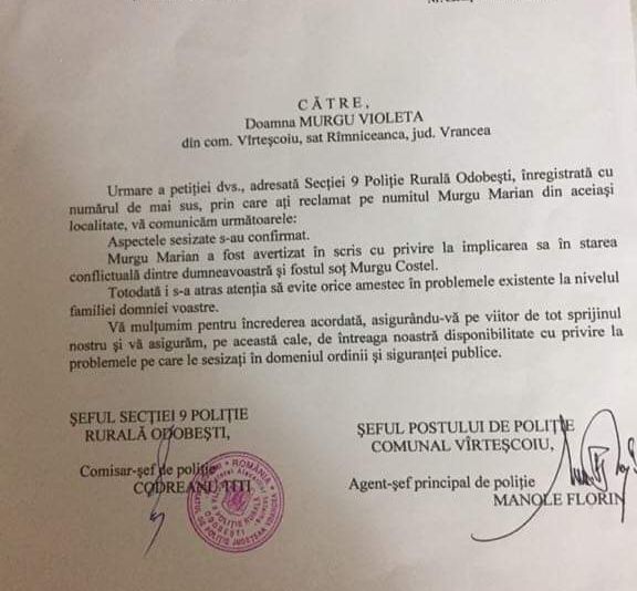 Una dintre zecile de plângeri depuse de femeie la Poliție[/caption]"Domnule Prim Procuror, Subsemnata MURGU VIOLETA,domiciliata in comuna Vârtescoiu, judetul Vrancea, formulez prezenta plângere penală împotriva făptuitorului MURGU COSTICĂ, domiciliat in comuna Vârtescoiu, sat Râmniceanca, județul Vrancea, pentru săvârșirea infracțiunii de HĂRȚUIRE, prevăzută și pedepsită de art. 208 alin. 1 și 2 din Codul Penal.Motivele plângerii: În fapt, făptuitorul Murgu Costică, încă de la data pronunțării divorțului, dar mai ales in ultima perioada de timp, in mod repetat ma urmărește, ma supraveghează atat la domiciliu cât și in Focșani, in concediu și oriunde ma aflu, fără niciun drept sau interes legitim, cauzându-mi prin aceste fapte o teama, o frica permanenta, atat mie cât și fiicei mele, dar și altei persoane care locuiește in casa mea, respectiv De Feo Maria-Michela, astfel ca viața mea a devenit un coșmar. De asemenea, caută permanent sa mi provoace necazuri prin diferite apeluri telefonice, mesaje, atat personal cât și prin alte persoane. A recurs, inclusiv, la publicarea unor poze de-ale mele, personale, pe unele conturi ale lui de Facebook, tot cu scopul de a ma denigra in public, lucru pe care il voi demonstra cu probe. Unele din aceste mesaje le anexez la prezenta plângere. Prejudiciul pe care mi-l creează este unu enorm, atât în rândul consătenilor din localitatea unde locuiesc, in rândul prietenilor, dar și la locul de munca, respectiv in Spitalul Militar Focșani, unde sunt salariați care ma cunosc și unde lucrez ca asistenta medicală. De asemenea, este in pericol și fiica mea Murgu Andreea-Paula care suporta toată aceasta hărțuire permanenta și care ne face sa trăim cu teama și mereu sub atacurile făptuitorului, pe diferite cai, uneori acționând sub imperiul alcoolului. Hotărârea de divorț a fost pronunțată in 2016. Spre exemplu, făptuitorul m-a urmărit inclusiv atunci când, in 2017, am plecat in concediu pe litoralul Marii Negre, unde ma aflam cu mai multe persoane, iar el ma urmarea ascuns după șezlonguri, pe plaja. Nu știu cum m-a găsit pe plaja de la Mamaia. Așadar, este foarte periculos și mereu motivează faptul ca lui nu are ce sa-i facă nimeni pentru ca are rude și relații in Poliție. Acum, deși are Ordin de restricție de la Instanța, continua sa-l încalce, cu știrea și sub privirea polițiștilor din comuna Vârteșcoiu și nu numai. Eu, cu fiica mea și cu cealaltă persoana, tot de sex feminin, cetățean italian care locuiește cu mine, trăim un adevărat coșmar de ani de zile căruia nicio instituție a Statului Roman nu vrea sa-i pună capăt și să ne redea liniștea la care avem dreptul ca orice cetățean al acestei țări. În data de 3 Septembrie, a pătruns in locuința mea, respectiv in camera in care locuiește Michela, de unde a sustras un telefon mobil și a căutat in lucrurile personale ale noastre și ale Michelei. Deși am sesizat lucrătorii postului de Poliție Varteșcoiu, nu au efectuat cercetări privind acest furt și nu știu dacă au înregistrat fapta. Vă rog sa-mi fie comunicat numărul de dosar înregistrat la Parchet pentru aceasta fapta de furt. Domnule Procuror Șef, ultima mea speranța este la dumneavoastră, ca sa puneți capăt acestui coșmar! Am dreptul la o viața liniștita și liberă ! La cine trebuie sa apelez ca sa-mi regăsesc aceasta viața normala? Poliția nu poate sa-l liniștească! După aceasta intervenție la dumneavoastră, ma văd nevoită sa iau calea mass-mediei centrale și sa-mi povestesc calvarul pe care il suport de doi ani de zile. In drept, fapta constituie infracțiunea de HĂRȚUIRE, prevăzută și pedepsita de art. 208 alin. 1 și 2 din Codul Penal", se arată în plângerea depusă.