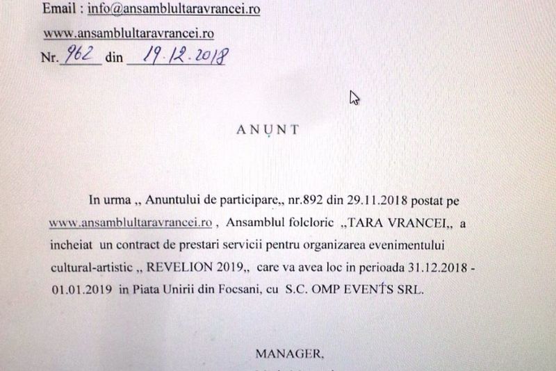Spectacolul de Revelion din acest an, din Piața Unirii din Focșani, va cuprinde muzică populară și muzică ușoară. Primii pe scenă vor urca membrii Ansamblului Folcloric ”Țara Vrancei”, la ora 19.30. Vor urma Geta Postolache, Laura Lavric, Iuliana Beregoi, trupa etno Datina, Anda Adam, trupa de hip-hop Bug Mafia și trupa austriacă Opus. Membrii acestei trupe un singur hit internațional - Live is life - lansat în anul 1984. Anul 2018 se încheie, în Piața Unirii, cu lasere și artificii, iar spectacolul de Revelion cu formația Ro-Mania. Nu vor lipsi prezentatorii Iuliana Tudor și Octavian Ursulescu. Primăria și Consiliul Local Focșani au alocat pentru acest spectacol suma de 980.000 de lei, fără tva, prin intermediul Ansamblului Folcloric ”Țara Vrancei”.