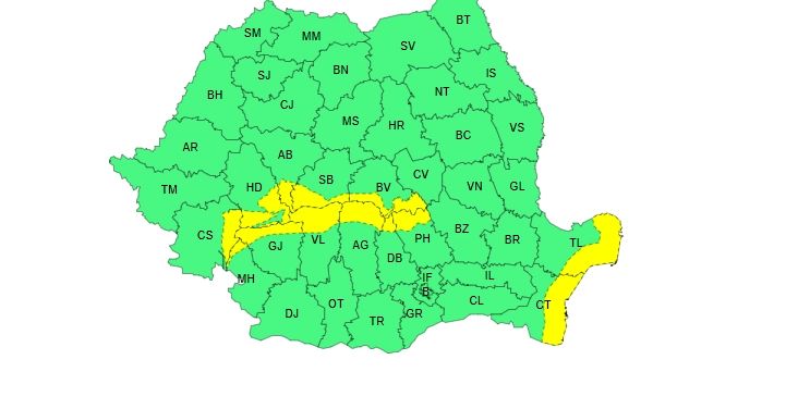 Tot luni, ANM a emis o atenţionare Cod galben privind intensificări ale vântului, valabilă luni, între orele 10.00 şi 20.00, în zona de litoral a judeţelor Constanţa şi Tulcea. Aici, local şi temporar vântul va avea viteze la rafală de 50...60 km/h.