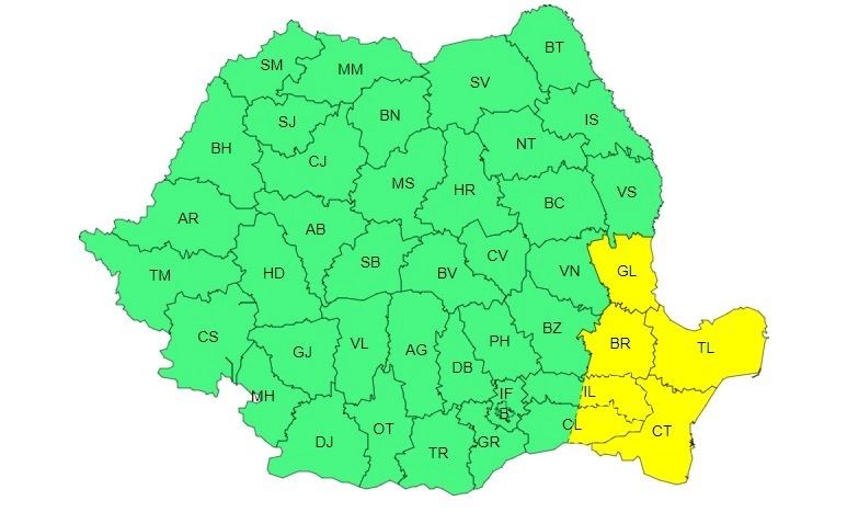 Vântul va avea intensificări în Dobrogea, estul Munteniei și sud-estul Moldovei. Vor fi viteze în general de 55...65 km/h, iar în județul Constanța și pe litoral, rafalele vor depăși temporar 70 km/h.