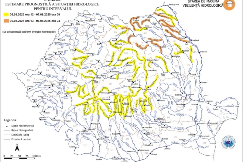 Institutul Naţional de Hidrologie şi Gospodărire a Apelor a emis o avertizare Cod portocaliu valabilă miercuri, între orele 13.00 şi 24.00, pentru anumite sectoare de râuri din judeţele Suceava, Neamţ, Harghita, Botoşani şi Iaşi.