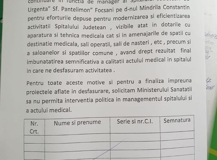 Directorul Spitalului Județean Focșani și-a pus angajații să conceapă o scrisoare de laudă, pentru a nu fi demis