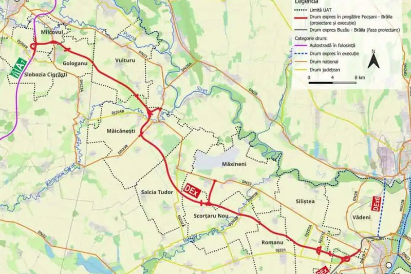 Compania Națională de Investiții Rutiere a semnat contracte pentru 105 kilometri de drum de mare viteză și o valoare de peste 10 miliarde de lei pentru Autostrada ,,Unirii” A8 și Drumul Expres Focșani-Brăila.Contractul care vizează construirea Drumului Expres Focșani-Brăila (73,5 km) a fost atribuit asocierii de constructori din România SA&PE Construct S.R.L (Lider asociere) - Spedition UMB-Tehnostrade S.R.L.- Arcada Company.Pentru cel mai lung tronson de drum de mare viteză care va fi construit în cadrul unui singur contract termenul de realizare este de 42 de luni și are o valoare de 4,29 miliarde lei.