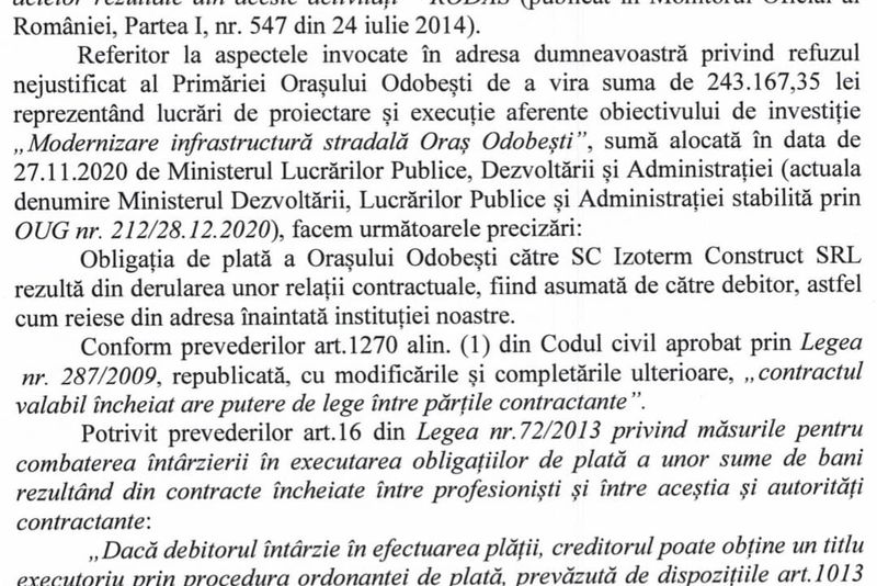 Primarul orașului Odobești și 3 funcționari din primărie s-au ales cu plângere penală din partea unei firme de construcții. Această firmă execută mai multe lucrări pe raza orașului Odobești, pe baza unor contracte semnate cu administrația locală. Plângerea penală depusă la Parchetul de pe lângă Tribunalul Vrancea face referire la presupuse abuzuri săvârșite de autoritatea locală în privința gestionării fondurilor publice. ”Fără nicio justificare, fără niciun argument, UAT Odobești a refuzat efectuarea plății, păstrând în mod nelegal aceste fonduri alocate de minister în conturile UAT Odobești”, se arată în plângerea penală a companiei. Mai mult, banii au fost returnați Ministerului Dezvoltării. Pe lângă cererea de achitare a drepturilor contractuale, compania a calculat dobânzi și penalități de aproape 24.000 de lei până pe 1 februarie a.c., dată la care a fost depusă plângerea la Parchet. ”Astfel, față de gravele încălcări săvârșite de funcționarii din cadrul UAT Odobești, față de modul nelegal de gestionare a fondurilor publice, față de împovărarea bugetului UAT Odobești cu obligații suplimentare constând în dobânzi, majorări de întârziere, penalități la plată prin refuzul nejustificat de a achita la termen contravaloarea facturii fiscale acceptată la plată și care, în mod corect a fost înregistrată în evidențele UAT Odobești în vederea achitării, vă solicităm să dispuneți efectuarea de cercetări sub aspectul săvârșirii infracțiunii de abuz în serviciu, urmând a ne constitui parte civilă.”, se menționează în plângerea depusă la Parchetul de pe lângă Tribunalul Vrancea. Pe lângă plângerea penală, compania a depus sesizări la Corpul de Control al Prim-Ministrului și la Camera de Conturi Vrancea.