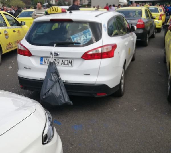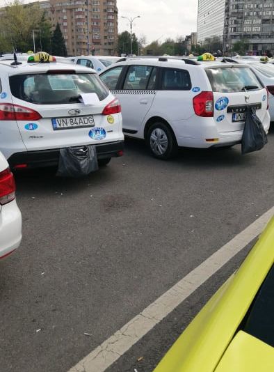 GALERIE FOTO Taximetriștii focșăneni - dovadă de bun simț, la protest: au pus saci de gunoi în spatele mașinilor