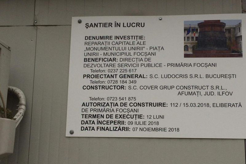 În an centenar, reabilitarea Obeliscului din Piața Unirii din Focșani nu e gata nici acum, deși termenul de finalizare a lucrărilor expiră astăzi. De doi ani, simbolul Unirii este în șantier, autoritățile municipale oferind explicații care mai de care mai hilare cu privire la neputința de a reabilita acest monument.