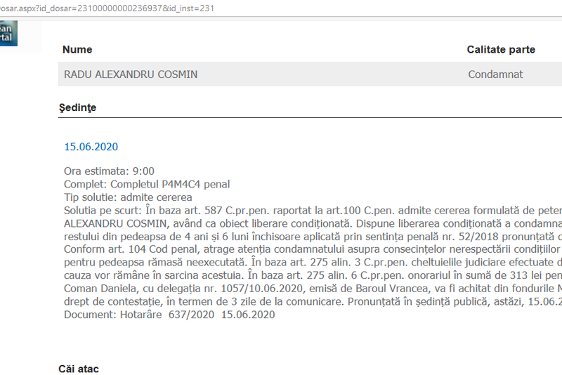 Alexandru Radu Cosmin, din satul Argea, comuna Ploscuţeni, care în luna septembrie a anului 2017 a bătut un adolescent nevinovat, în vârstă de 16 ani, până l-a lăsat fără suflare, rupându-i gâtul, a fost eliberat condiţionat din închisoare după doi ani de pedeapsă. El a fost condamnat în anul 2018 la 4 ani şi şase luni închisoare, pentru lovituri cauzatoare de moarte, practic o încadrare mai uşoară decât cea de omor. Magistraţii de la Judecătoria Focşani au considerat că cei doi ani petrecuţi după gratii sunt suficienţi, astfel că, pe data de 15 iunie 2020, au admis cererea de liberare condiţionată formulată de agresor. „În baza art. 587 C.pr.pen. raportat la art.100 C.pen. admite cererea formulată de petentul condamnat RADU ALEXANDRU COSMIN, având ca obiect liberare condiţionată. Dispune liberarea condiţionată a condamnatului din executarea restului din pedeapsa de 4 ani şi 6 luni închisoare aplicată prin sentinţa penală nr. 52/2018 pronunţată de Tribunalul Vrancea. Conform art. 104 Cod penal, atrage atenţia condamnatului asupra consecinţelor nerespectării condiţiilor liberării condiţionate, pentru pedeapsa rămasă neexecutată. În baza art. 275 alin. 3 C.pr.pen. cheltuielile judiciare efectuate de stat în prezenta cauza vor rămâne în sarcina acestuia. În baza art. 275 alin. 6 C.pr.pen. onorariul în sumă de 313 lei pentru avocat din oficiu Coman Daniela, cu delegaţia nr. 1057/10.06.2020, emisă de Baroul Vrancea, va fi achitat din fondurile Ministerului Justiţiei. Cu drept de contestaţie, în termen de 3 zile de la comunicare. Pronunţată în şedinţă publică, astăzi, 15.06.2020″, se arată în decizia magistraţilor.