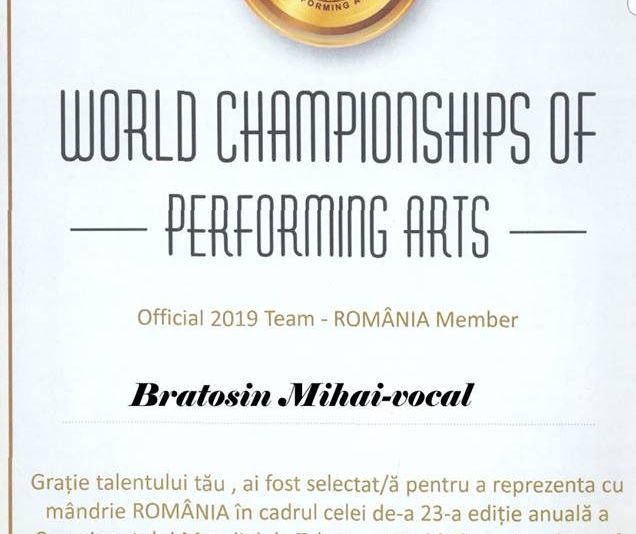 Vrânceanul Mihai Bratosin se pregătește de Hollywood. După numeroase premii obținute la festivalurile naționale și internaționale de muzică, micul artist Mihai Bratosin a fost invitat să participe la un festival mondial ce va avea loc la Los Angeles. Manifestarea se va desfășura în luna iulie 2019. "WORLD CHAMPIONSHIPS OF PERFORMING ARTS"- HOLLYWOOD, LOS ANGELES, 12-21 IULIE 2019. Mulțumim, din toată inima, pentru invitație!!!