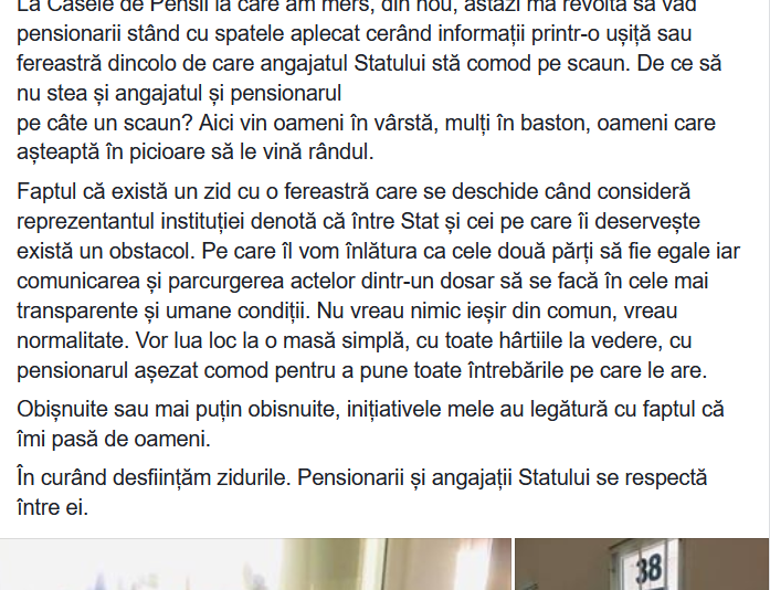 Ministrul Muncii, Violeta Alexandru, a anunțat, în urmă cu puțin timp, că va elimina, din Casele de Pensii, clasicele ghișee cu gemuleț, unde pensionarii sunt nevoiți să aștepte, în picioare, până când funcționarul binevoiește să deschidă."A venit momentul să spargem zidurile inutile care despart cetățenii de serviciile de calitate pe care le merită. Încep cu o Casă de Pensii din București. Extindem în țară. La Casele de Pensii la care am mers, din nou, astăzi mă revoltă să văd pensionarii stând cu spatele aplecat cerând informații printr-o ușiță sau fereastră dincolo de care angajatul Statului stă comod pe scaun. De ce să nu stea și angajatul și pensionarul pe câte un scaun? Aici vin oameni în vârstă, mulți în baston, oameni care așteaptă în picioare să le vină rândul. Faptul că există un zid cu o fereastră care se deschide când consideră reprezentantul instituției denotă că între Stat și cei pe care îi deservește există un obstacol. Pe care îl vom înlătura ca cele două părți să fie egale iar comunicarea și parcurgerea actelor dintr-un dosar să se facă în cele mai transparente și umane condiții. Nu vreau nimic ieșit din comun, vreau normalitate. Vor lua loc la o masă simplă, cu toate hârtiile la vedere, cu pensionarul așezat comod pentru a pune toate întrebările pe care le are. Obișnuite sau mai puțin obisnuite, inițiativele mele au legătură cu faptul că îmi pasă de oameni. În curând desființăm zidurile. Pensionarii și angajații Statului se respectă între ei", a scris ministrul pe pagina sa de Facebook.