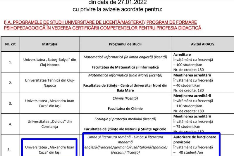 Consiliul ARACIS a decis astăzi să acorde autorizație de funcționare provizorie Universității ”Alexandru Ioan Cuza” din Iași pentru filiala Focșani a Facultății de Litere (Limba și literatura română – Limba și literatura modernă), licență, cursuri de zi, cu 40 de studenți pe an.
