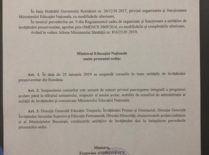 Bugetarii nu vor avea parte de o minivacanță la acest sfârșit de săptămână. Însă elevii și cadrele didactice vor sta acasă și vineri, 25 ianuarie, conform unui ordin al ministrului Educației Naționale, Ecaterina Andronescu. Oficial, motivul principal al acestui ordin îl reprezintă creșterea numărului de cazuri de gripă și infecții respiratorii. ”În data de 25 ianuarie 2015 se suspendă cursurile în toate unitățile de învățământ preuniversitar din România”, se spune la art.1 al ordinului Ecaterinei Andronescu.