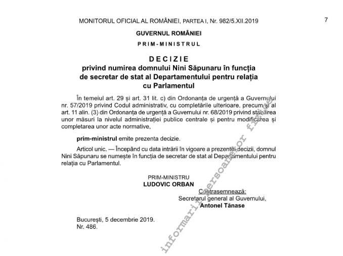 Premierul Ludovic Orban l-a numit, joi, pe Nini Săpunaru, un veteran al PNL Vrancea, în funcția de secretar de stat al Departamentului pentru relația cu Parlamentul, potrivit unei decizii publicate în Monitorul Oficial.