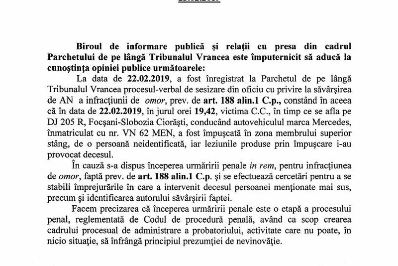 În urmă cu puțin timp, Parchetul de pe lângă Tribunalul Vrancea a transmis un comunicat cu privire la asasinatul de aseară, de la Slobozia Ciorăști. Potrivit procurorilor vrânceni, s-a început urmărirea penală in rem pentru infracțiunea de omor.