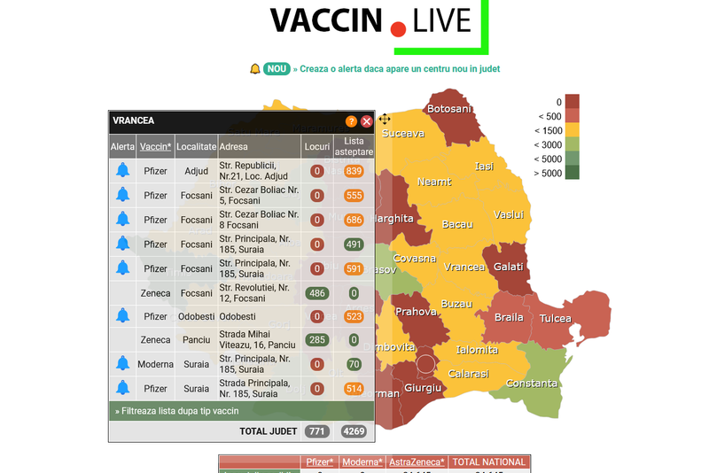 Peste 700 de locuri sunt disponibile pentru vaccinare, în Vrancea. La Centrul de Vaccinare din Strada Revoluției, din Focșani, sunt disponibile 486 de locuri, la Panciu, la centrul de Vaccinare din Strada Mihai Viteazu 16, sunt disponibile 285 de locuri. Ambele Centre au locurile disponibile pentru vaccinul făcut de Astra Zeneca. Informații în timp real, AICI