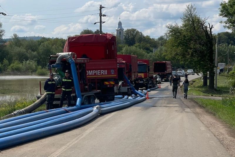 În localitatea Băcel din județul Covasna, pompierii se află în continuare la fața locului și intervin cu pompe pentru a degaja apa.