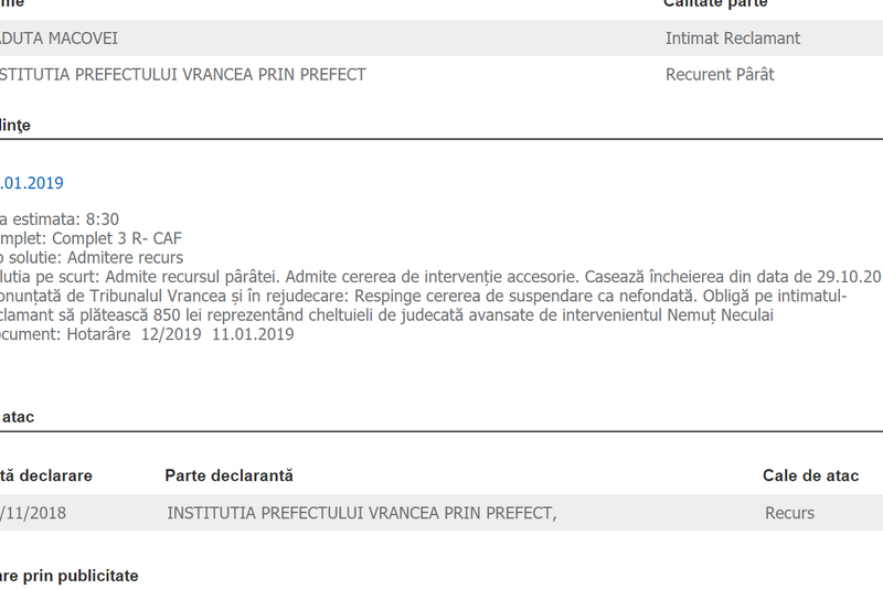 Răduță Macovei (PSD) nu mai este primarul comunei vrâncene Reghiu. Decizia aparține Curții de Apel Galați și este definitivă și executorie. Fostul edil avea o condamnare cu suspendare, de doi ani, în urma căreia i se interzisese dreptul de a mai ocupa o funcție publică. Sesizarea a făcut-o fostul viceprimar, Neculai Nemuț, iar Prefectura Vrancea i-a anulat mandatul, însă Macovei a contestat în instanță decizia Prefecturii. La Vrancea, Macovei a avut câștiga de cauză, însă Prefectura a făcut recurs la Curtea de Apel Galați și a câștigat.