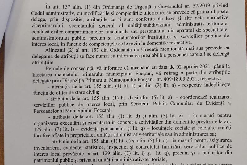 Primarul municipiului Focșani a retras mare parte din atribuțiile viceprimarilor. După două săptămâni de la ”intrarea în pâine”, Ana Maria Dimitriu (PNL) și Alexandra Tătaru (USR) rămân doar cu câteva atribuții, conform dorinței primarului Cristi Misăilă (PSD). Cele două doamne viceprimar au primit înștiințarea cu dispoziția primarului la birou, fără alte explicații. ”Am fost astăzi pe teren și, când m-am întors la birou, doamna secretar mi-a înmânat mapa cu documente, inclusiv cu dispoziția domnului primar privind retragerea de atribuții, începând de mâine, 2 aprilie. Nu mi s-au transmis motivele acestei decizii a domnului primar. Dar, dacă mă gândesc la ședința de ieri a Consiliului Local, la un moment dat, primarul a spus că ne retrage atribuțiile. Ceea ce s-a și întâmplat, astăzi.”, a declarat viceprimarul Ana Maria Dimitriu, citată de Vrancea24.ro. Cel mai probabil, decizia primarului are la bază scandalul din urmă cu două zile, când în spațiul public a apărut o înregistrare audio în care Misăilă o jignea și o dădea afară din birou pe Anamaria Dimitriu, una dintre cele două viceprimărițe ale Focșaniului.