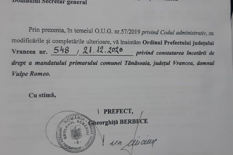 Primarul comunei vrâncene Tănăsoaia, Romeo Vulpe (PSD), care tocmai a câștigat un nou mandat, a fost suspendat de prefectul județului Vrancea, Gheorghiță Berbece, în baza condamnării penale definitive pe care acesta a primit-o zilele trecute. Curtea de Apel Galați s-a pronunțat în dosarul în care Vulpe a fost acuzat de ”săvârșirea infracțiunii de folosirea sau prezentarea cu rea-credință de documente ori declarații false, inexacte sau incomplete, dacă fapta are ca rezultat obținerea pe nedrept de fonduri din bugetul general al Uniunii Europene sau din bugetele administrate de acestea ori în numele ei”. Sentința Tribunalului Vrancea, din 10 august a.c., prevedea o pedeapsă de 3 ani cu suspendare și interzicerea unor drepturi, inclusiv cel de a fi ales în funcții publice. Magistrații Curții de Apel Galați s-au pronunțat definitiv în acest dosar, în urma apelului părților implicate.