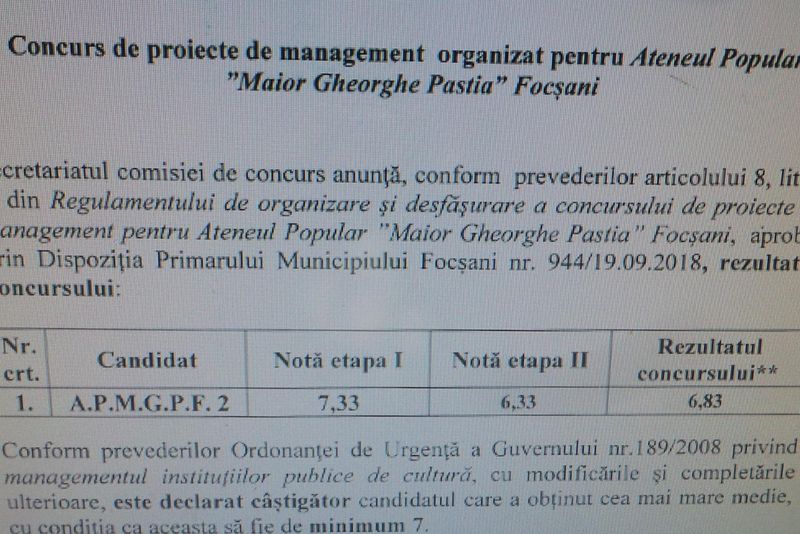 După circa un an și jumătate de ”zbatere”, primarul Focșaniului și-a văzut îndeplinită o dorință arzătoare - a ”scăpat” de Valentin Gheorghiță din fruntea Ateneului Popular ”Mr. Gh. Pastia”. În urma susținerii concursului de proiecte de management, Valentin Gheorghiță s-a ales cu media finală 6,83, sub minima 7.00 pentru rămânerea în funcția de director al Ateneului Popular. Valentin Gheorghiță a luat nota 7,33 la proba de analiză a proiectului de management, depus la Primăria Focșani, dar la susținerea proiectului în fața comisiei de concurs nu a obținut decât 6,33. Astfel, media de 6,83 s-a dovedit a fi insuficientă pentru a rămâne în funcție. Inițial, Valentin Gheorghiță a avut un contracandidat, în persoana unui profesor și membru în corul Pastorala, Ionuț Drilia, însă dosarul acestuia de concurs a fost respins de la început.