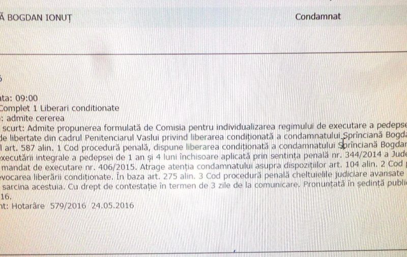 “Cu privire la implicarea condamnatului în activitățile socio-educative organizate în cadrul penitenciarului, avocatul solicită a se observa atât din referatul și din înscrisurile depuse la dosar, că a fost o persoană corectă și permanent a dat dovadă de reintegrare socială, iar în acest referat se arată că provine dintr-o familie organizată, aspect ce rezultă din eforturile părinților care s-au interesat în permanență de situația condamnatului în penitenciar, de modul în care execută pedeapsa, toate aceste eforturi ale tatălui său care-i va asigura acestei persoane condamnate un loc de muncă după liberare, toate aceste aspecte sunt în măsură a conduce la admiterea propunerii. Mai arată avocatul faptul că persoana privată de libertate a înțeles că regimul penitenciar nu este o poveste, și-a dat seama de toate implicațiile negative care au avut loc asupra lui dar mai ales asupra părinților acestuia, care nu au făcut altceva în tot acest timp decât să-l aștepte să execute pedeapsa și să se întoarcă în familie”, se arată în motivarea judecătorilor care l-au liberat condiționat în anul 2016.