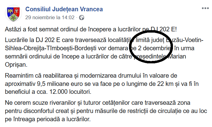 Drumul județean DJ202E Sihlea - Voetin, din județul Vrancea, arată ca după bombardament, în ciuda promisiunilor președintelui Consiliului Județean Vrancea, Marian Oprișan, de a începe lucrările în 2 decembrie, anul curent. Localnicii sunt revoltați că vor fi nevoiți, și anul acesta, să se deplaseze pe un drum care se prezintă sub orice critică și să-și rupă mașinile. Asta pentru că nici un utilaj nu a ajuns în zonă.