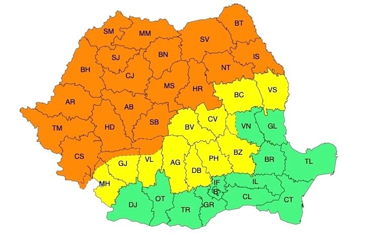 În intervalul menționat, în Banat, Crișana, Maramureș, cea mai mare parte a Transilvaniei și jumătatea de nord a Moldovei, precum și în Carpații Occidentali, vestul Carpaților Meridionali și nordul Carpaților Orientali vor fi perioade cu vijelii puternice, cu viteze la rafală de 70...90 km/h, grindină de medii și posibil mari dimensiuni, averse torențiale. În intervale scurte de timp sau prin acumulare cantitățile de apă vor fi de 25...40 l/mp și izolat peste 50 l/mp.