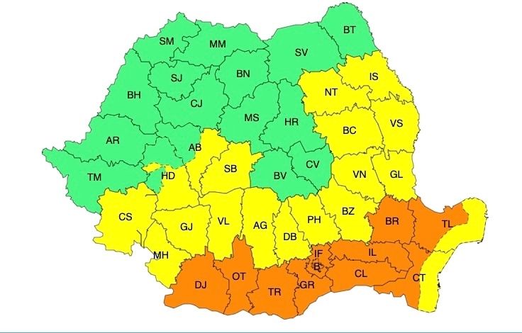 În intervalul menționat, în sud-estul Olteniei, sudul și estul Munteniei și în partea continentală a Dobrogei, se vor înregistra temperaturi deosebit de ridicate pentru această dată, maximele se vor situa, în general, între 35 și 37 de grade, va fi caniculă și disconfort termic accentuat, iar indicele temperatură-umezeală (ITU) va depăși pragul critic de 80 de unități.
