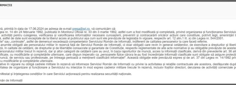 (…) prevederile normative în vigoare nu obligă cadrele militare în rezervă să informeze Serviciul Român de Informații cu privire la activitatea și relațiile contractuale ale acestora, desfășurate după data trecerii în rezervă.