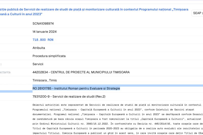 „Abordarea cercetării va pleca de la constatarea că programul TM2023 a pus accentul într-o mare măsură pe nevoia de a completa idealul excelenței culturale și artistice și succesul numeric la public, cu accentul pus pe implicarea și pe efectele resimțite de oameni, public, decidenți și profesioniști, rolul și impactul asupra acestora în proiectele și experiențele culturale, prin abordări cu o dimensiune de intervenție culturală sau socială, prin educație. Analiza va urmări cu precădere dinamica relației cu publicul în cazul proiectelor și evenimentelor din Programul TM2023. Parametrii minimi de validare a cercetării cantitative cu privire la operatorii culturali incluși în Programul cultural național „Timișoara – Capitală Europeană a Culturii în anul 2023”– cum implică aceștia publicul, cu ce succes etc. –, pentru ca studiul să fie considerat reprezentativ: minim 60% dintre entitățile înregistrate în program pe toată durata acestuia, și minim 80% pentru perioada 2021-2023. Durata chestionarului trebuie să fie de minim 20 de minute, de preferat CATI sau CAWI. Parametrii minimi de validare a cercetării cantitative cu privire la implicarea publicului din regiunea Banatului (altul decât cei din Timișoara) pentru a identifica tipologia categoriilor de public, preferințe și tipare de consum, vor presupune: proiectarea și aplicarea a 3 sondaje de opinie pe eșantioane de minim 385 de persoane fiecare, CATI, CAPI sau CAWI”, se menționează în caietul de sarcini al contractului.