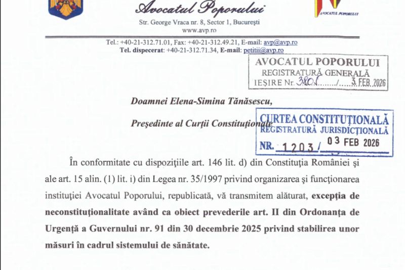 Avocatul Poporului a sesizat Curtea Constituțională a României (CCR) cu o excepție de neconstituționalitate privind ordonanța de urgență a Guvernului care taie plata pentru prima zi a concediului medical. Sesizarea a fost transmisă și privește măsura aplicabilă certificatelor eliberate în perioada 1 februarie 2026 – 31 decembrie 2027.