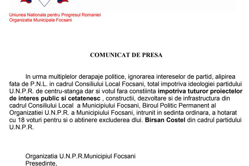 "In urma multiplelor derapaje politice, ignorarea intereselor de partid, alipirea fata de P.N.L. in cadrul Consiliului Local Focsani, total impotriva ideologiei partidului U.N.P.R. de centru-stanga dar si votul fara constiinta impotriva tuturor proiectelor de interes public si cetatenesc , constructii, dezvoltare si de infrastructura din cadrul Consiliului Local a Municipiului Focsani, Biroul Politic Permanent al Organizatiei U.N.P.R. a Municipiului Focsani, intrunit in sedinta ordinara, a hotarat cu 18 voturi pentru si o abtinere excluderea dlui. Birsan Costel din cadrul partidului U.N.P.R", se arată în comunicat.În replică, Bîrsan spune că nu a fost chemat să i se facă această judecată și că va face plângere penală celor care l-au exclus. UNPR Focșani nu mai există, nu au sediu, unde s-au întâlnit acești domni ca să mă execute? Voi contesta această excludere și voi face plângere penală împotriva lor, e o hotărâre ilegală, nu am fost anunțat, nu am fost prezent, nu am primit nici o hârtie în acest sens. E clar că am devenit incomod pentru actuala conducere a primăriei și a PSD, pentru lucrurile pe care le scot la iveală, ilegalitățile și jaful banului public la care se dedau cei din majoritatea din CL Focșani. Au încercat să mă corupă, să mă mituiască, să mă sperie, au ajuns la ultima găselniță - să mă excludă", a declarat Costel Bîrsan.Dacă excluderea va fi validată de instanță, Bîrsan își va pierde mandatul de consilier local și va fi înlocuit de următorul supleant de pe listă.