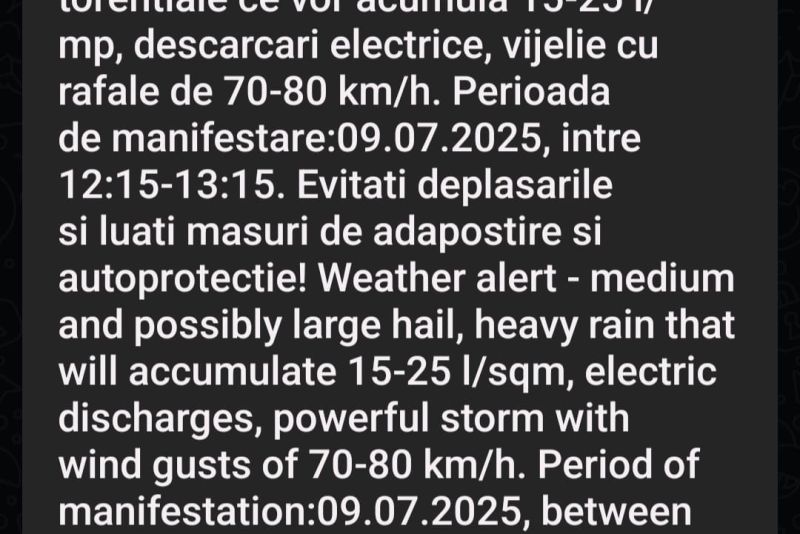 Autoritățile au emis și avertizare de tip RO Alert de vreme severă.