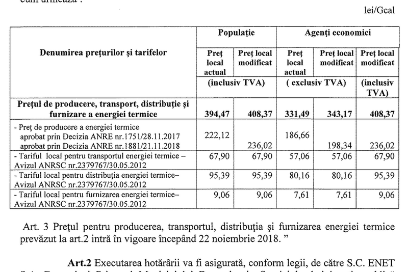 Ședința de ieri a Consiliului Local Focșani, pe lângă faptul că s-a desfășurat, în mare parte, fără prezența consilierilor PNL care au plecat din sală, a adus o noutate pentru agenții economici focșăneni. A scumpit prețul gigacaloriei pe care o vor plăti. Profitând de absența consilierilor PNL, consilierii PSD au suplimentat ordinea de zi cu un proiect prin care gigacaloria pentru agenții economici va crește de la 394 de lei la 408 lei, după cum ne-a certificat purtătorul de cuvânt al ENET Focșani. Prețul pentru populație s-a mărit și el, dar va fi subvenționat de primărie. Întrebat de ce a votat acest proiect, consilierul PSD Radu Nițu ne-a declarat: "Este o hotărâre ANRE (Autoritatea Națională de Reglementare a Energiei) pe care am respectat-o". Întrebat unde se mai regăsește sloganul cu care PSd a câștigat alegerile "Îndrăznește să crezi", Radu Nițu a răspuns: la dumneavoastră!