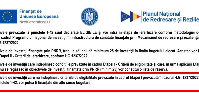 Obiectivele de investiţii care nu îndeplinesc criteriile de eligibilitate prevăzute în cadrul Etapei I prevăzută în cadrul H.G. 1237/2022 (…) vor putea fi finanţate din alte surse bugetare, se arată în finalul documentului făcut public astăzi de către Ministerul Sănătății.