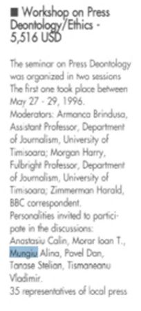Alina Mungiu, Pavel Dan, Stelian Tănase, Vladimir Tismăneanu și alti jurnaliști, au primit 5.516 dolari pentru o conferință despre etică și deontologie în presă.