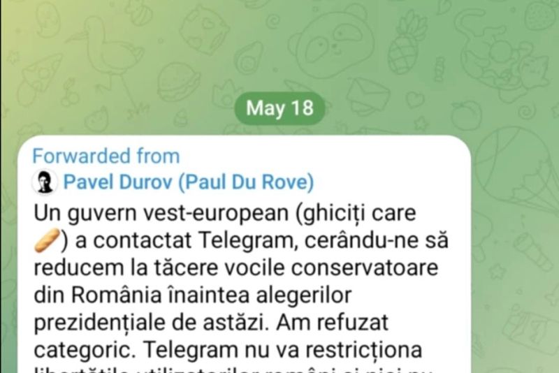 Fondatorul Telegram, Pavel Durov, acuză că guvernul unei țări din Europa de vest i-ar fi cerut să blocheze unele conturi cu viziuni conservatoare din România, pe fondul derulării alegerilor prezidențiale. Mesajul transmis pe aplicația de mesagerie a fost preluat și de agenția Reuters.