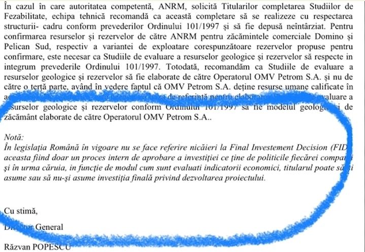 „Au fost două propuneri: ca operarea să fie alternativă împreună cu Petromul și se doreau negocieri cu OMV și discuții cu firma din Bahamas. Negocierile erau departe de a fi finalizate înainte de a fi eu revocat. În perioada mandatului meu, am trimis o echipă și au luat date financiare. Analiza trebuia făcută mai târziu, când începeau negocierile cu Exxon pentru preluarea părților. Eu am spus că, pe de o parte, să intrăm în discuții pe cooperare cu Petrom. Pe 13 ianuarie m-a revocat. În decembrie am scris o scrisoare la OMV.