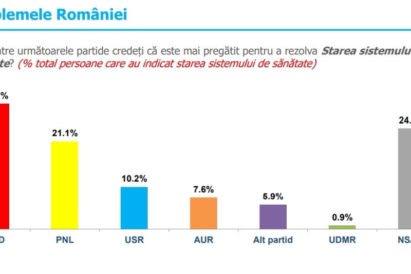 Referitor la partidul care ar putea salva sistemul de Sănătate din România, respondenții consideră că PSD este partidul salvator, la o distanță de 9 procente de PNL și 20 de USR.
